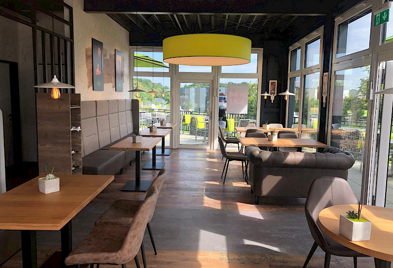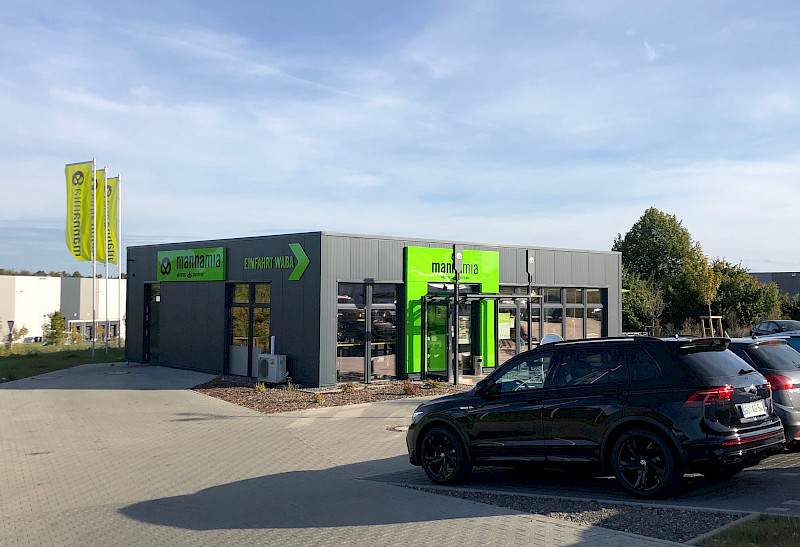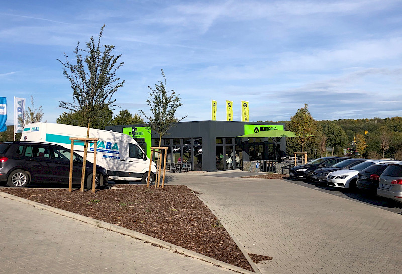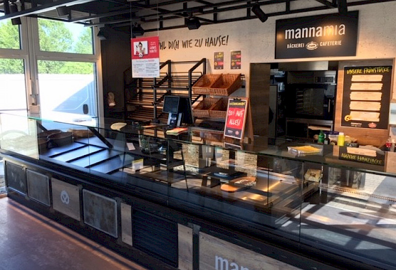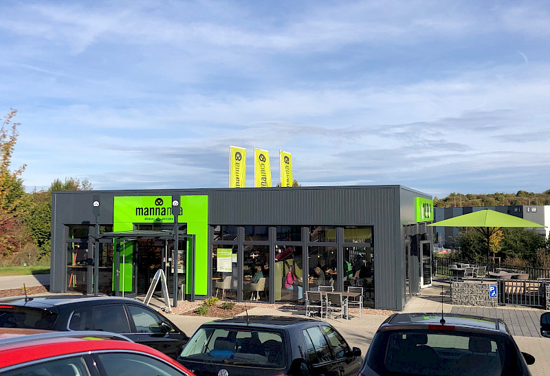 Erstellung eines Freestander Backshops mit Cafe und Bäckerei in Gerlach- Systembauweise auf dem Baufeld der Walter Braun Farbengroßhandel e. K.. Betreiber des Backshops ist die Bäckerei Ruch aus Rosdorf.